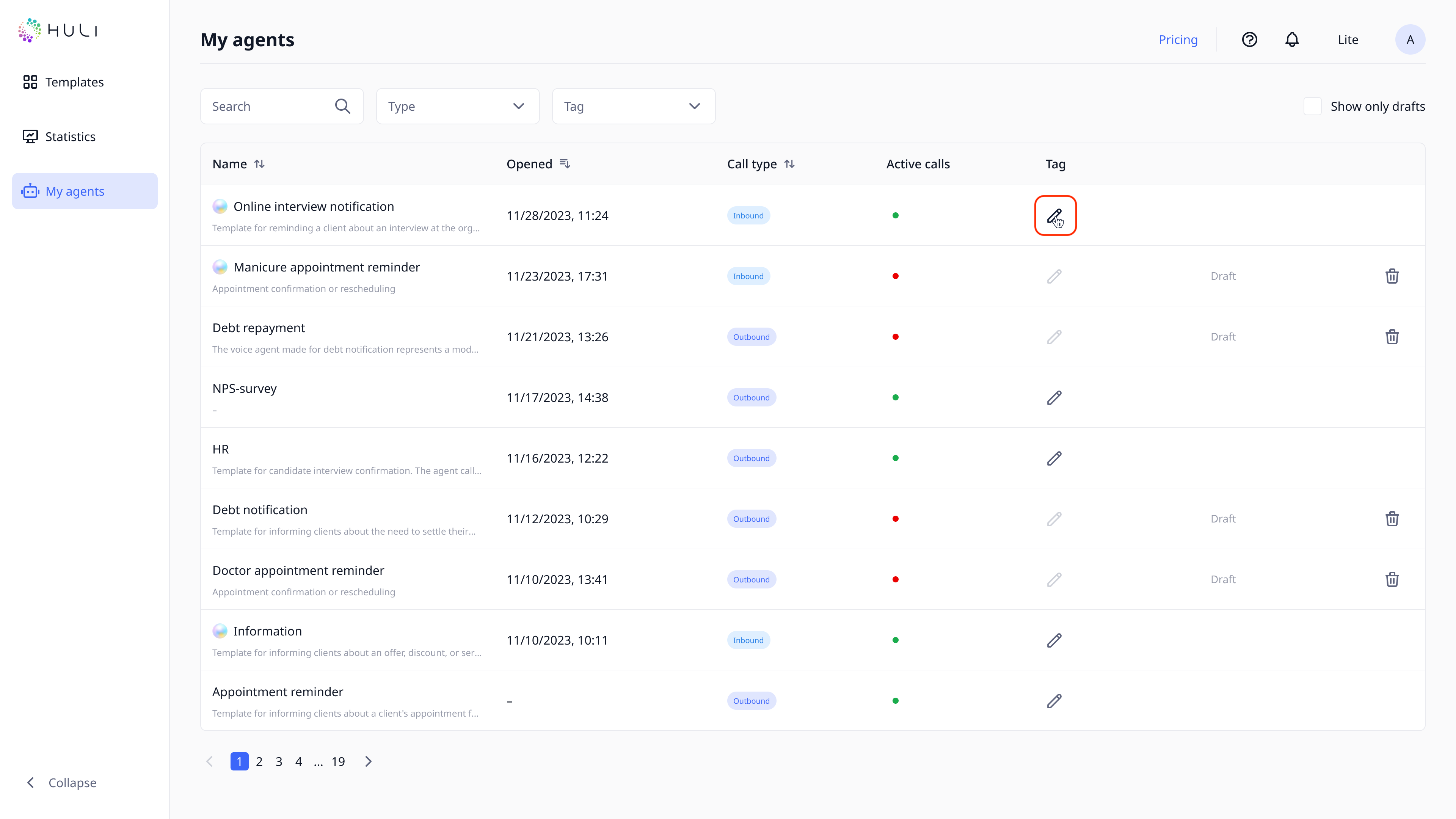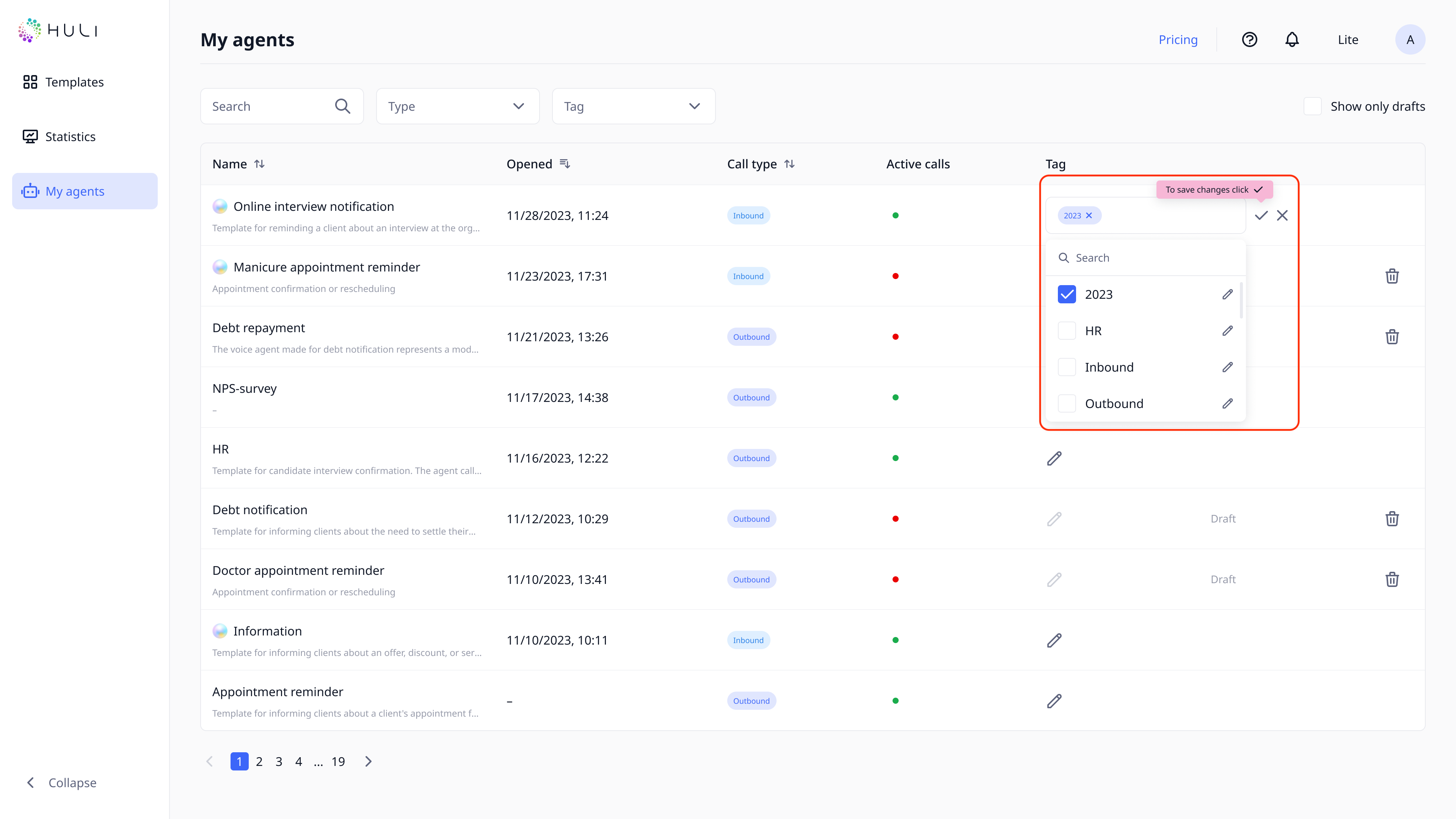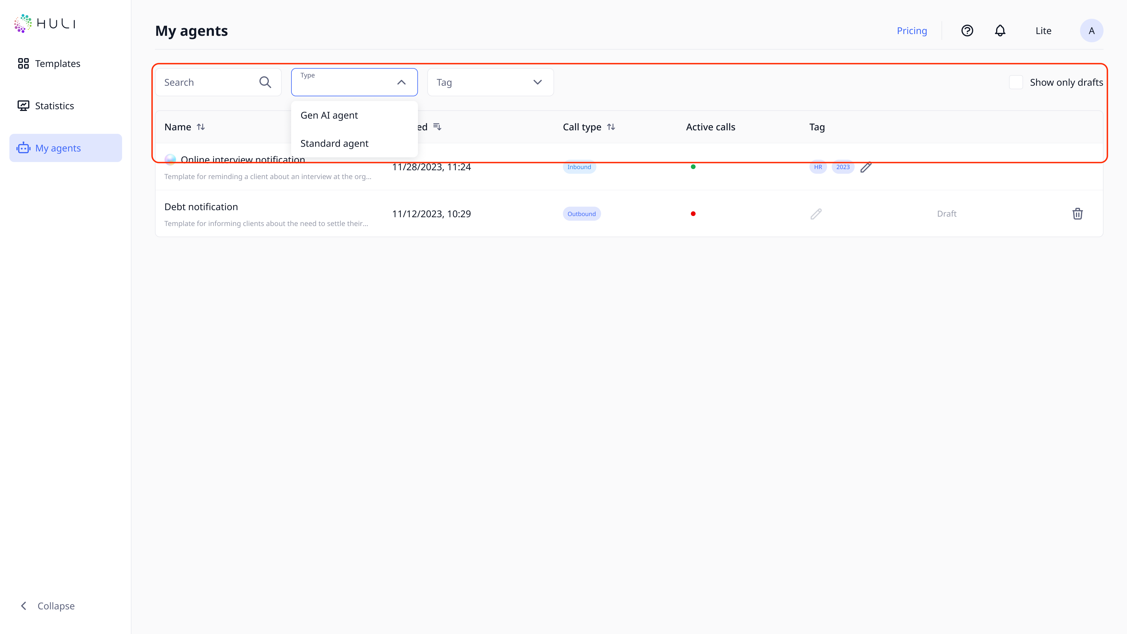 Use filters to display agents according to specific criteria. Filters are available for search, type of agent, tags and draft status.