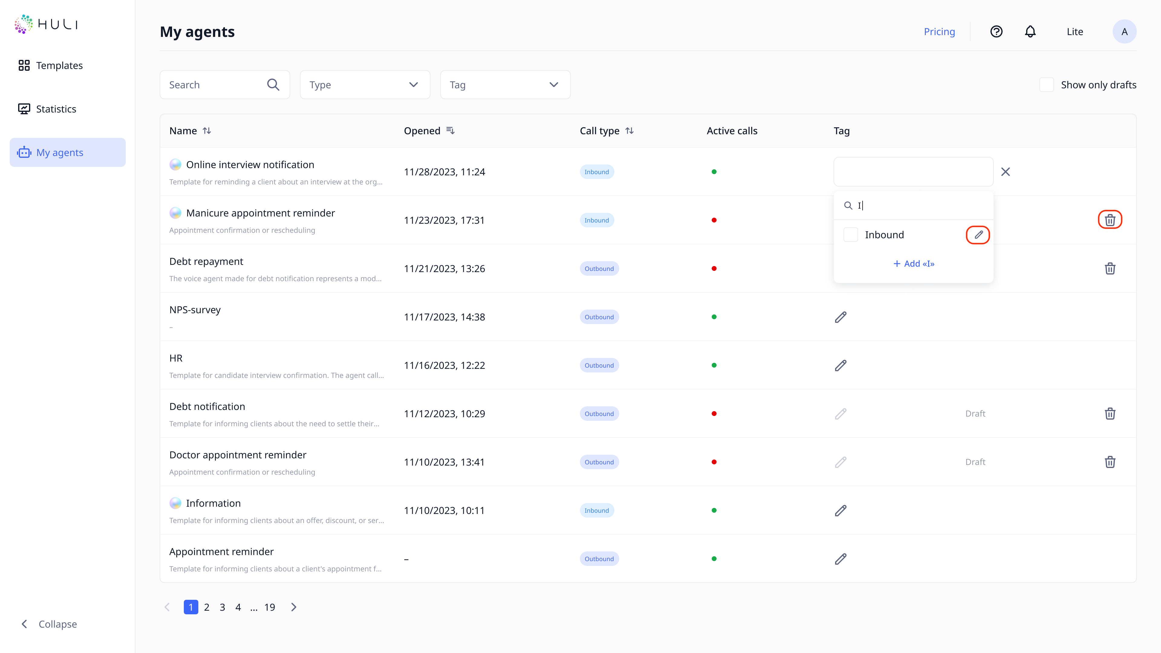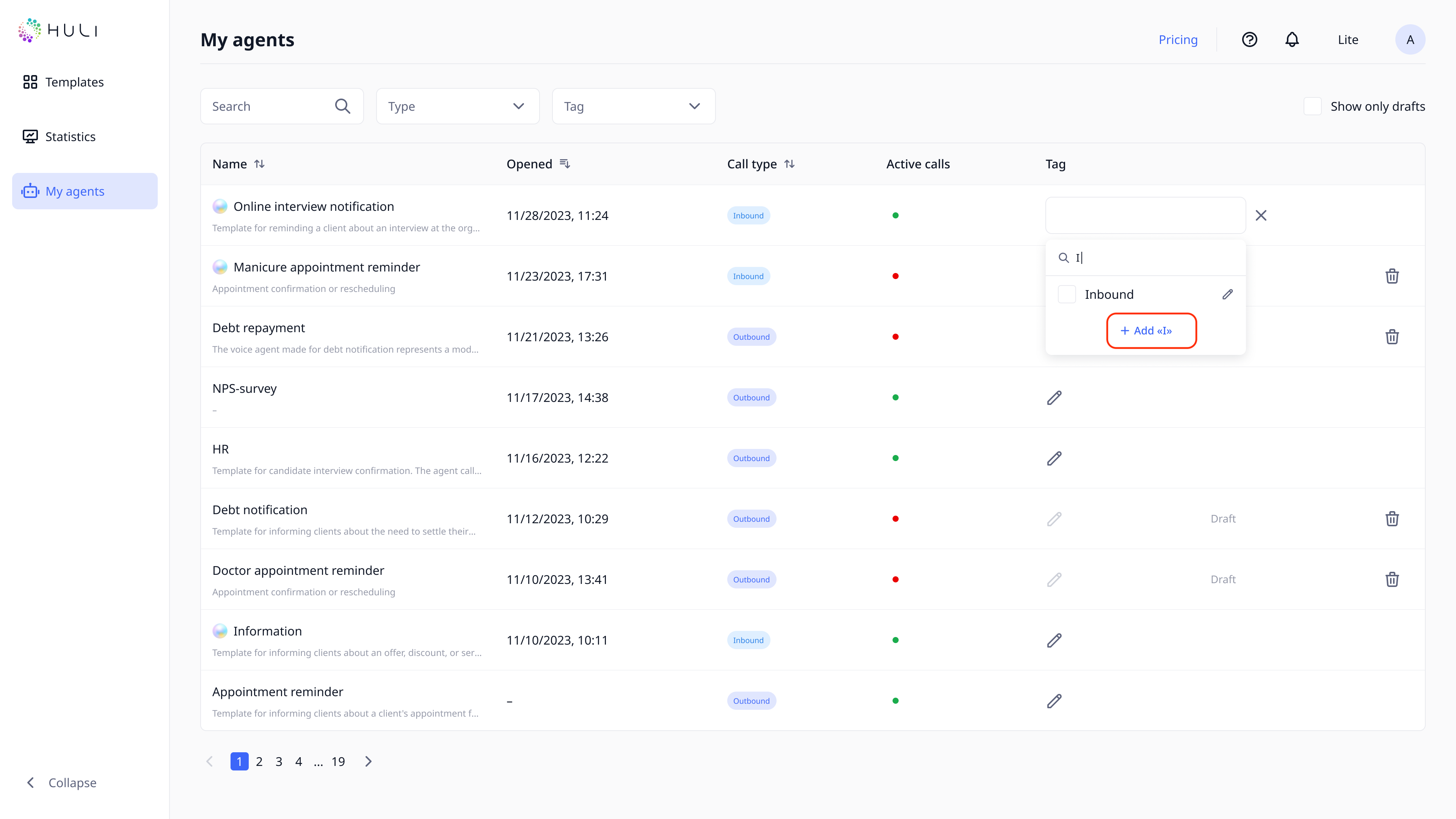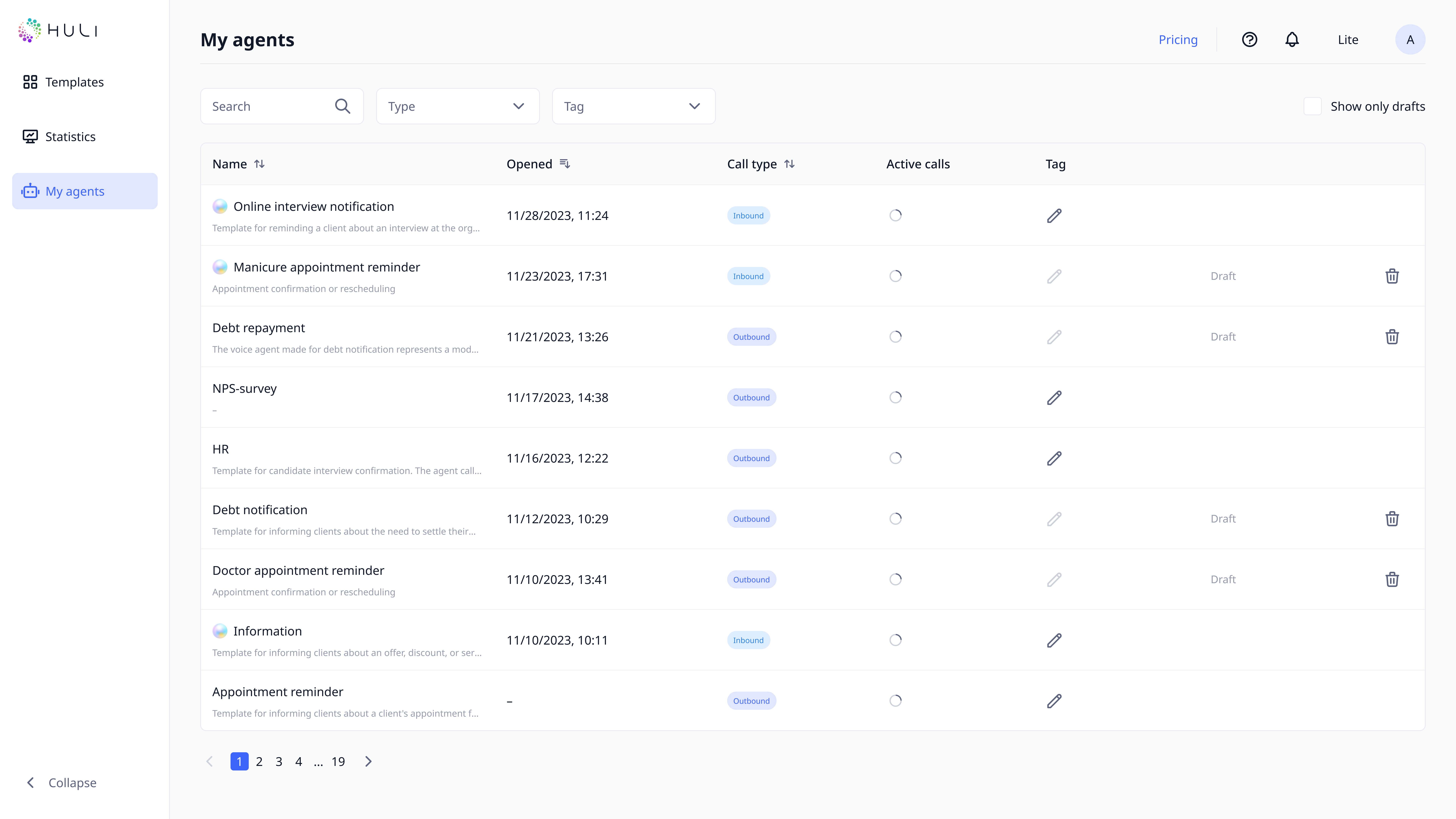 Use filters to display agents according to specific criteria. Filters are available for search, type of agent, tags and draft status.