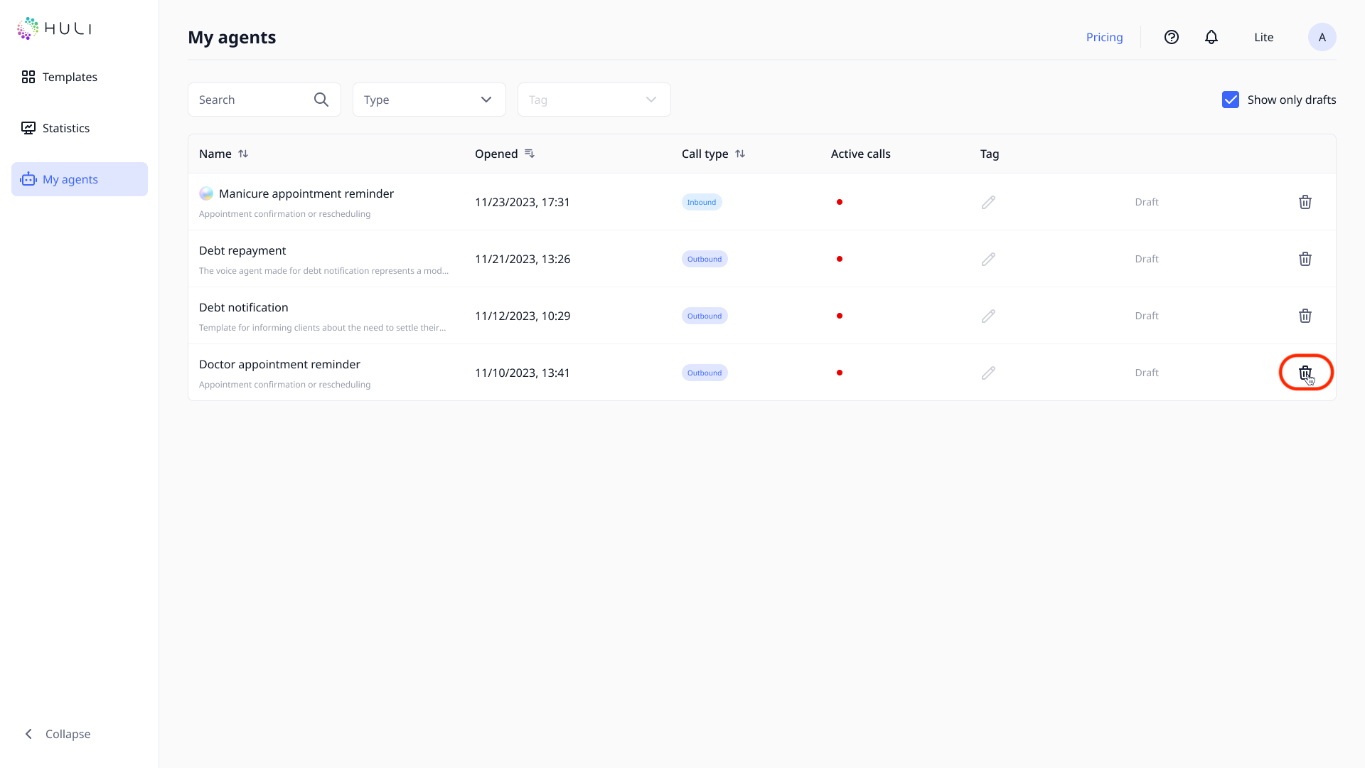 On this page, you can only delete agents that are drafts. To delete a fully configured agent, go to the page of agent and its settings.