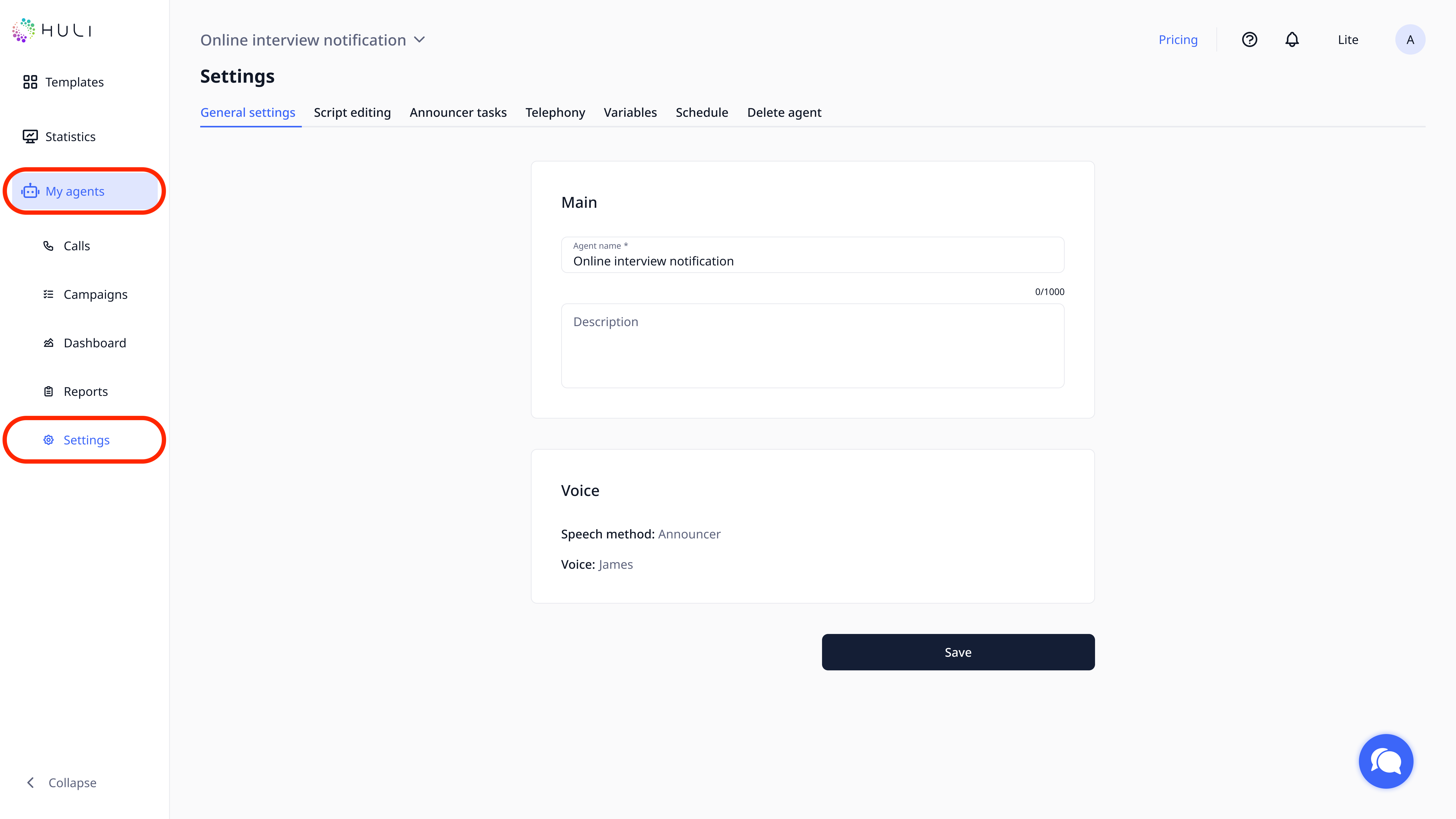 To edit and configure agents you need to go to their pages through the page “My agents” and choose “Settings”.