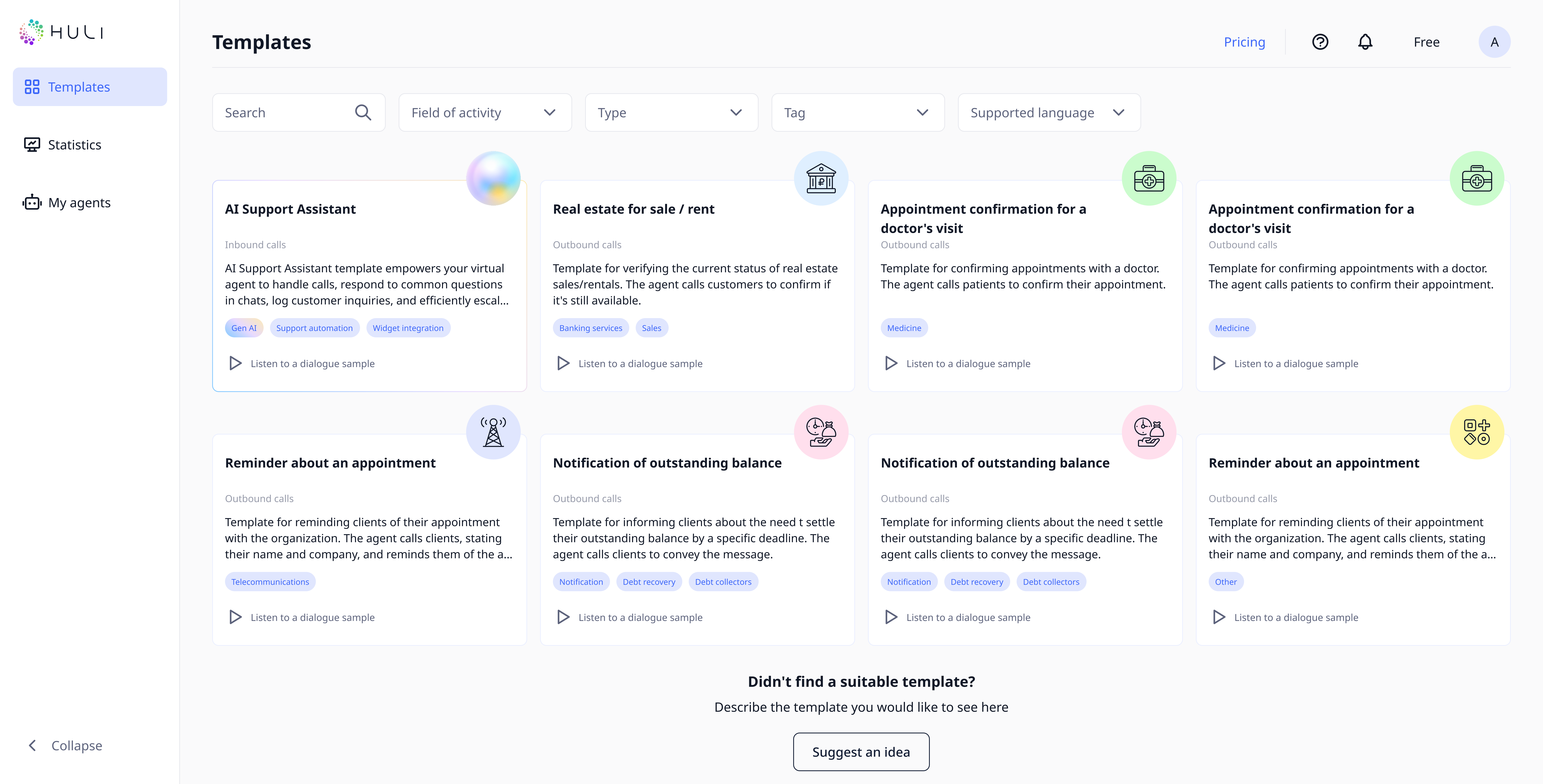 Select voice from the list for phone interactions. Choose it by tone, accent, and speaking style that represents your brand.