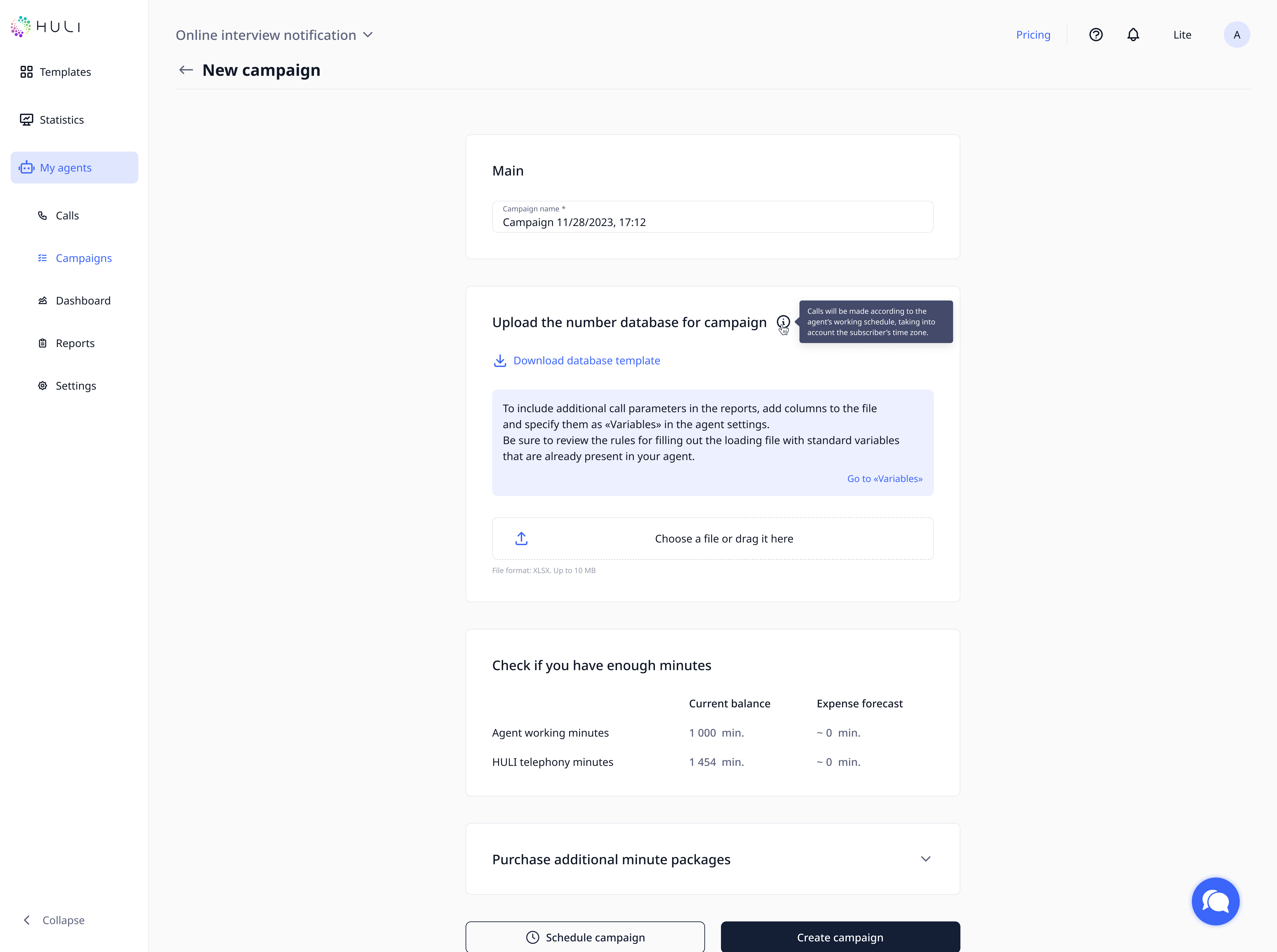 After making the first 500 calls, a "Check if you have enough minutes" block will appear on the page of creation campaign, allowing you to assess whether your current balance is enough for the planned outbound call.
