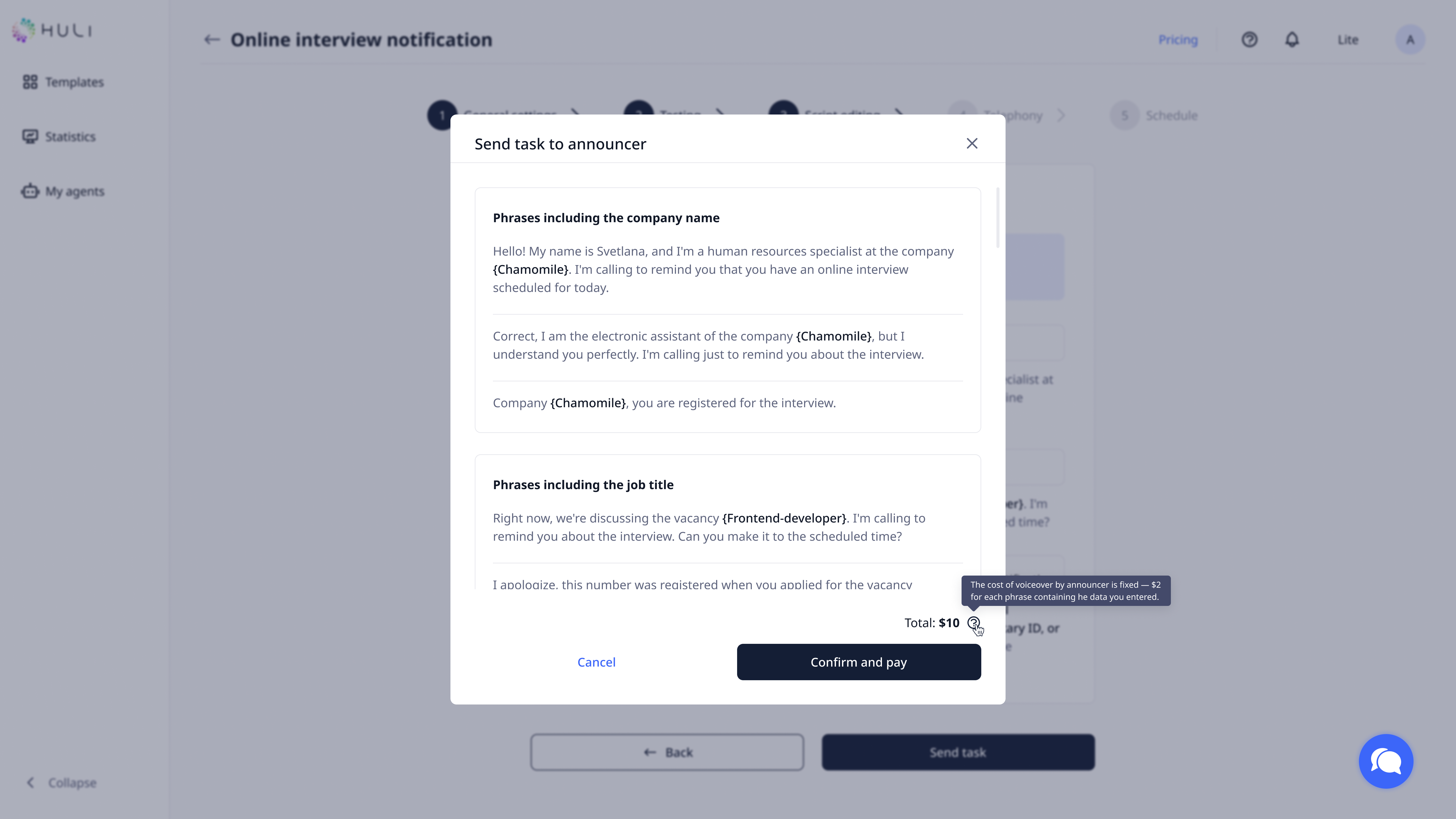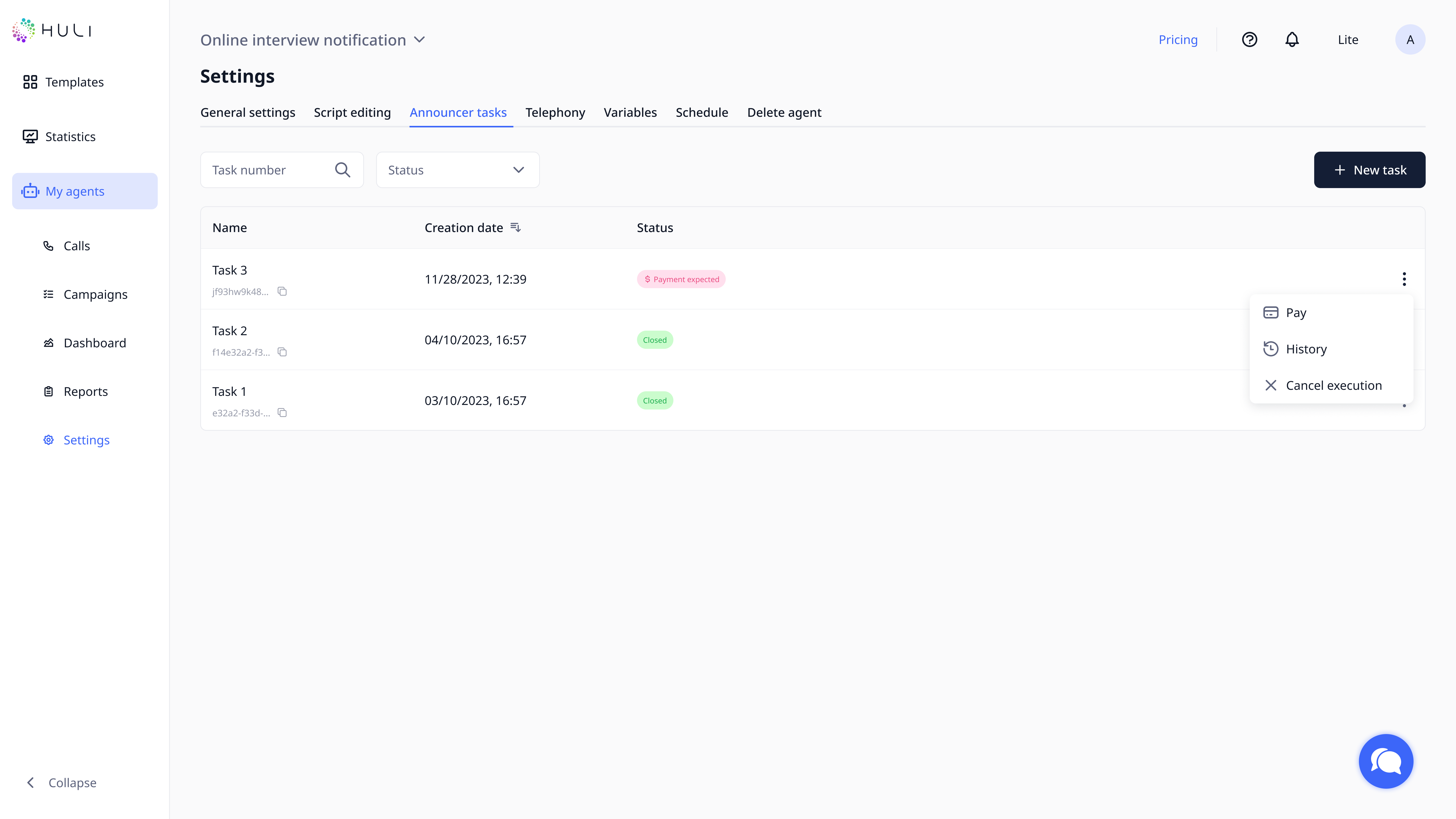 After completing your template customization, you need to confirm task to the announcer and pay for it. You can go to paying page from the task from Agent's Creation or pay for it from Settings. (Paying available only for Owner and Billing Manager roles)