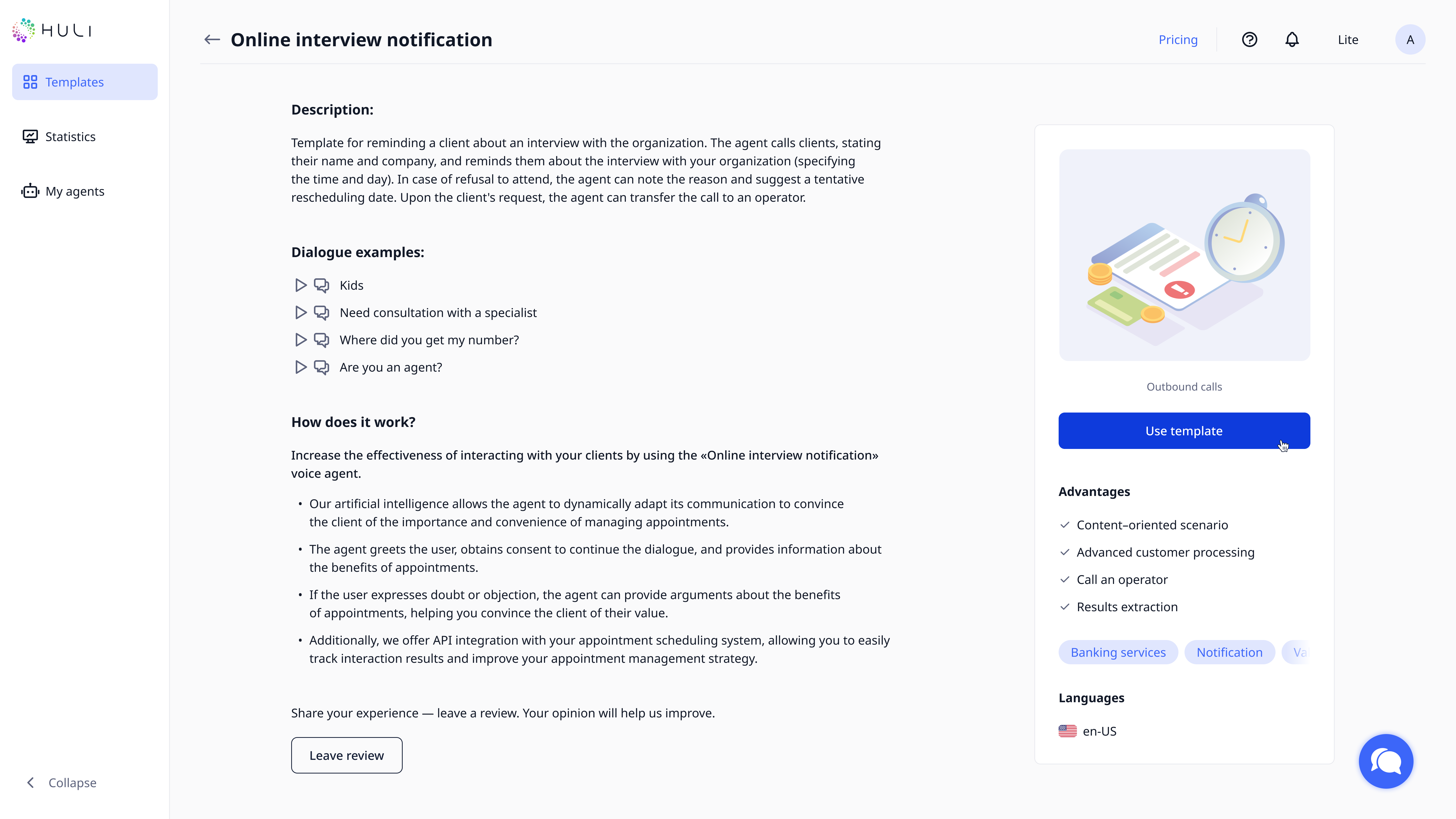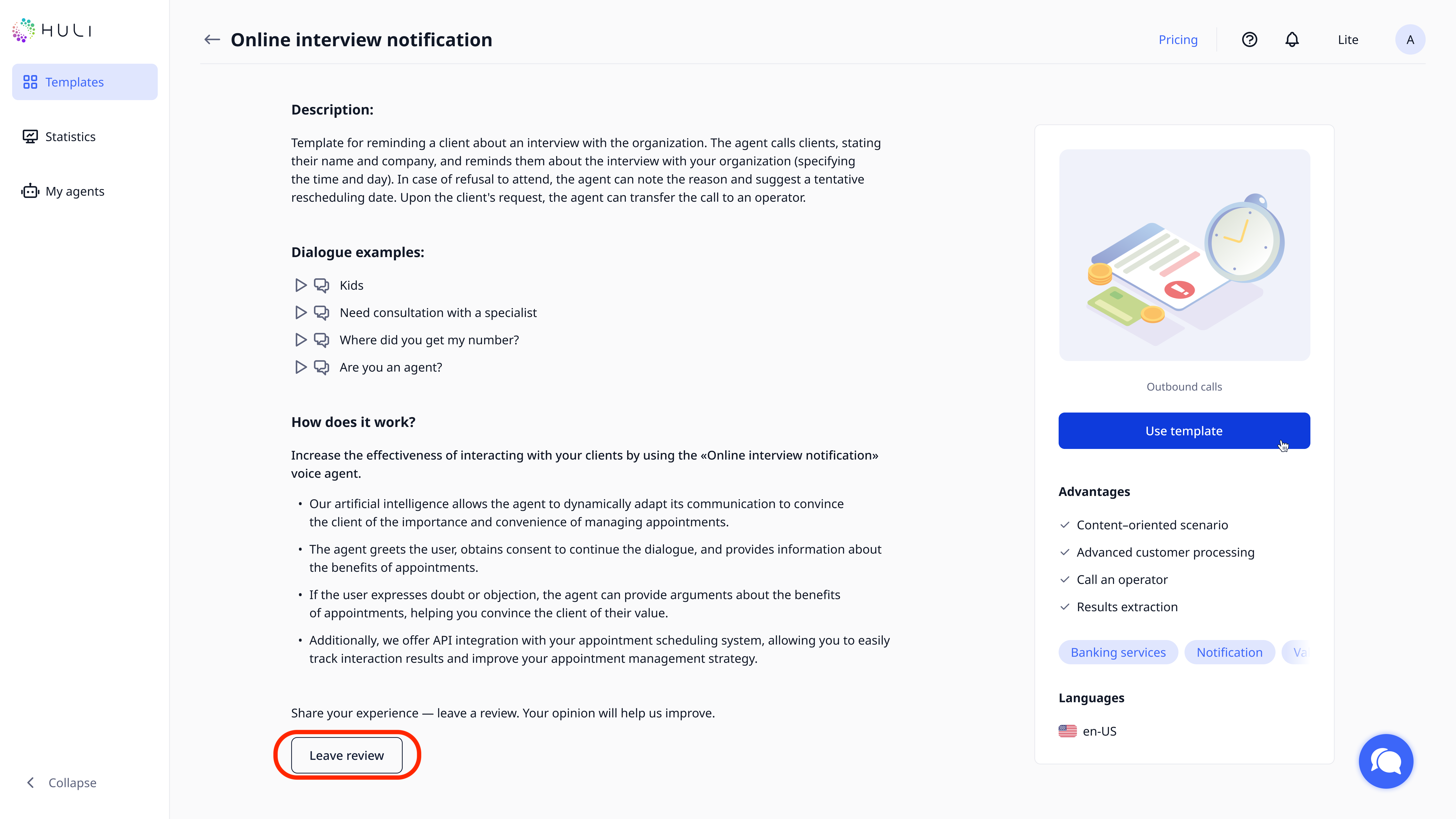 After using the template to create an agent and launching it, the "Leave review" button will become active. You'll be able to rate the template from 1 to 5 stars and share your impressions. After that click on the “Submit review” button so we can get your response.